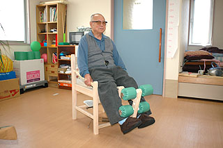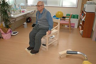 旧型のトレーニング・チェア「木の香」を使った、筋力トレーニング。「木の香」は現在製造中止なのですがこちらではご利用いただいていました。「木の香」を椅子の状態にして、座った状態で、ウッドブロック・トレーニング「座位つま先上げ」の実施